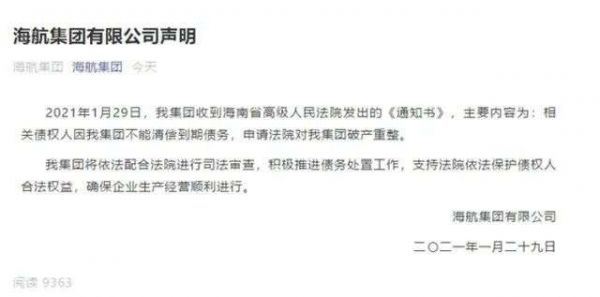 1月29日,海航集团发布公告表明,收到海南省高级人民法院发出的《通知书》,相关债权人因海航集团不能清偿到期债务,申请法院对海航集团破产重整。