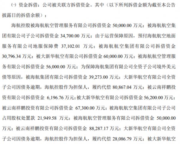 另外还包括海航控股为关联方提供担保的债务,因主债务人到期未偿付,债权人划扣公司的资金总额超过86亿元,还有关联方代收款和兑付员工理财的资金一共超过59亿元。