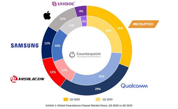 ▲2019、2020第三季度全球智能手机芯片组市场份额(图源:Counterpoint)