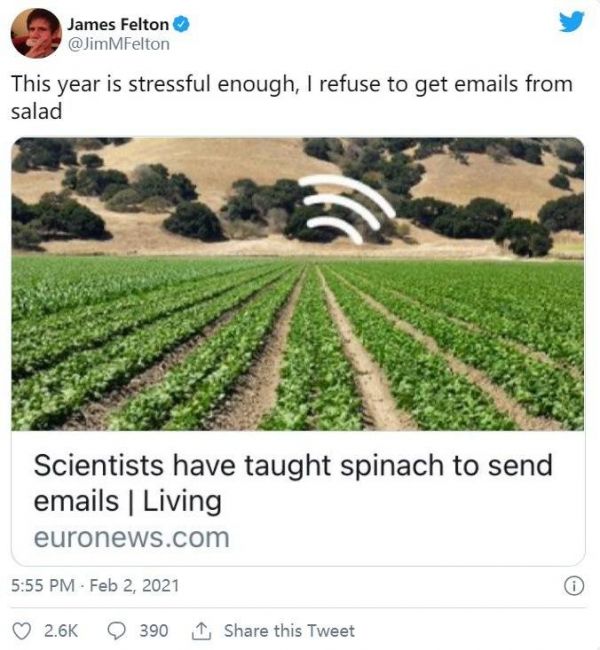 @IT之家【科学家成功 “教会”菠菜发送邮件】据外媒 euronews,科学家们进行了一项实验,让菠菜在探测到爆炸物时成功发送电子邮件,该研究结果已发表在 Nature 上。麻省理工学院的科学家们进行实验时,发现菠菜根可以检测到地下水中硝基芳香族化合物的存在,而硝基芳香族化合物通常用于炸药。菠菜根检测到硝基芳族化合物会向叶子发出信号,于是科学家们通过红外传感器接收了该信号,并通过无线继电器成功发送电子邮件。这项研究最开始用于改造植物,以探测野外的爆炸物,不过后来被改造用于探测土壤中的污染物和其他潜在的环境问题。IT之家了解到,该研究早在 2016 年就已公开,但直到最近才被人们关注。目前这一发现在国外社交媒体上一片火热,人们纷纷用菠菜玩梗。