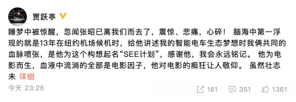 @新浪科技【贾跃亭发文悼念张昭:他为电影而生 我会永远铭记感谢他】贾跃亭在个人微博发文称,“睡梦中被惊醒,忽闻张昭已离我们而去了,震惊、悲痛,心碎!脑海中第一浮现的就是13年在纽约机场候机时,给他讲述我的智能电车生态梦想时我俩共同的血脉喷张,是他为这个构想起名“SEE计划”,感谢他,我会永远铭记。他为电影而生,血液中流淌的全部是电影因子,他对电影的痴狂让人敬仰。虽然壮志未酬,相信他在天堂里依然会追逐他的梦想、实现他的夙愿。”
