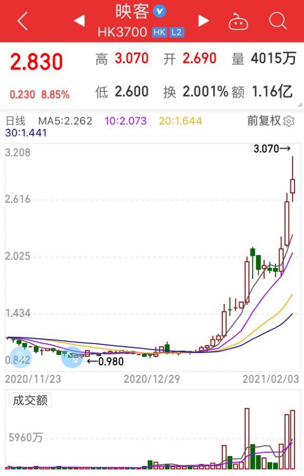 此外,互动娱乐直播平台映客近三个交易日也大涨51%,市值近57亿港元,创2018年10月以来新高。