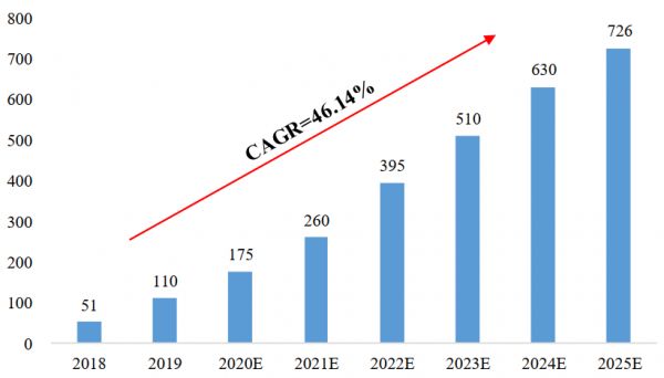 图4:2018 年-2025 年全球人工智能芯片市场规模,资料来源:Tractica