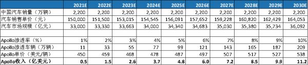 首先仅考虑中国市场,假设Apollo单车价值量500美元左右,随着汽车智能化渗透率持续提高,国内每年销售的2200万辆汽车中,预计到2030年,假设将有10%左右配备Apollo,则产生的商业化收入将达到11亿美元左右;粗略假设全球化收入将是中国区的3倍,则Apollo的整体收入预计在30亿美元左右。