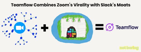 Teamflow把Zoom的病毒式传播与Slack的护城河结合到了一起。5月,我在《Zoom在扩张的时候,Slack在挖护城河》这篇文章里面写到了这两者之间的权衡取舍。我的观点是,尽管Zoom在短期内会受益于自己的上手容易,但这是在跟魔鬼做交易,因为得来容易的客户也容易失去。来得快的去得也快。(译者注:这是指Zoom不需要注册就可以马上使用)另一方面,Slack的护城河使得它没有办法像Zoom一样快速增长——对比一下加入Zoom所需要的工作以及在Slack组成起一支团队所需要的工作就知道了——但这些护城河也意味着客户的黏性更强,而且很长一段时间之内会随着Slack一起扩张。