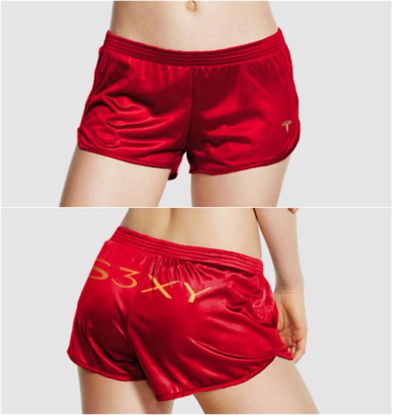 2020年,马斯克将这款做空短裤重新设计,颜色改为红色,更加醒目,面料从纯棉升级为绸面,甚至镶上金边,印上特斯拉LOGO和四款车型缩写“S3XY”,直接在商店上架。