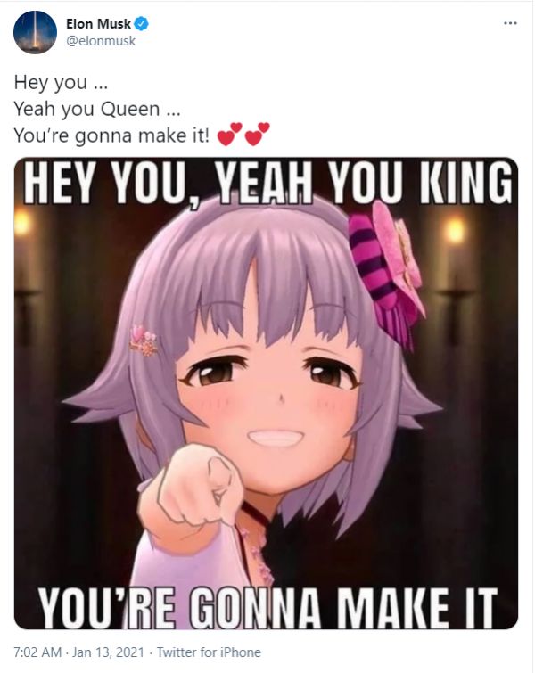 作为一个重度二次元玩家,马斯克自然也不会吝啬对动漫形象的夸奖。南梦宫股票上涨,就是因为马斯克在推特上发布了一则推文,并配上了一张在网上很火的舆水幸子的梗图。而这个人物形象来自于万代南梦宫的《偶像大师》系列。