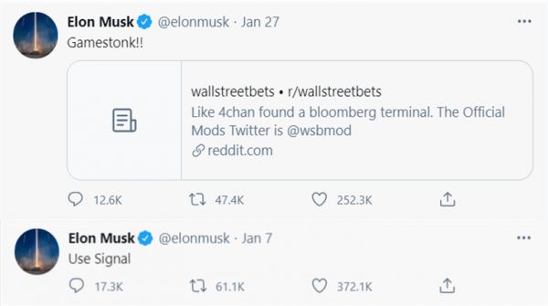 推特简介改为“Bitcoin”,一小时内比特币价格推高18%;“Gamestonk!!”,游戏驿站GME的股价瞬间暴涨60%;“Use Signal”,在苹果商店和谷歌Play,Signal下载量迅速爬到第一,服务器一度面临瘫痪。