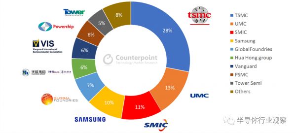 可以看出,排名前四的厂商分别为:台积电(市占率28%),联电(13%),中芯国际(11%),三星(10%)。