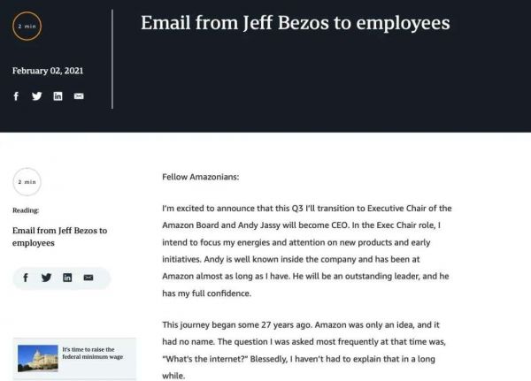 我在这里激动地宣布,我将在今年第三季度过渡到亚马逊董事长一职,安迪 · 杰西 (Andy Jassy)将接任 CEO。担任执行董事长后,我打算把自己的精力和注意力专注于新产品和早期计划上。安迪在公司内无人不知,在亚马逊的工作时间几乎和我一样长。他将会是一名出色的领袖,我对他充满信心。