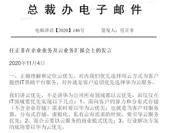 2020年11月4日,任正非在华为云业务的汇报会上强调,华为云是未来华为发展的一个重要业务,必须抓住全球云服务这个重要的机遇。