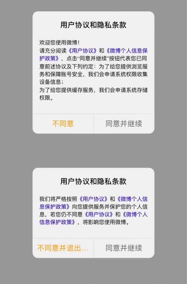 用户如果要使用该 App,就需要同意《用户协议》和《微博个人信息保护政策》相关条款,否则就会被强制退出。乍听起来有点问题,但其实企业已经履行了它的告知义务。爱加密副总裁程智力对 InfoQ 表示,据相关法律规定,企业要获得用户数据必须经过用户同意,否则就是违法,会被罚款并对相关 App 进行下架和整改。