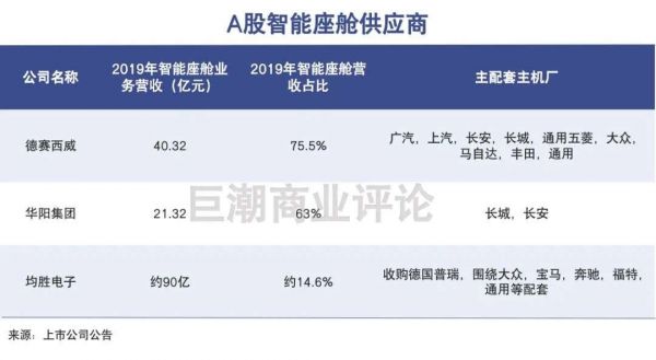 A股上市公司中,2019年德赛西威(SZ:002920)突破上汽大众、上汽通用和长安汽车等客户,开始配套车机系统和T-box。2020年,华阳集团(SZ:002906)开始为长安汽车UNI平台车型配套双联屏产品,同样实现为长安配套的突破。均胜电子(SH:600699)开始为国内南北大众配套CNS3.0座舱软件系统,实现对大众集团的全球配套。
