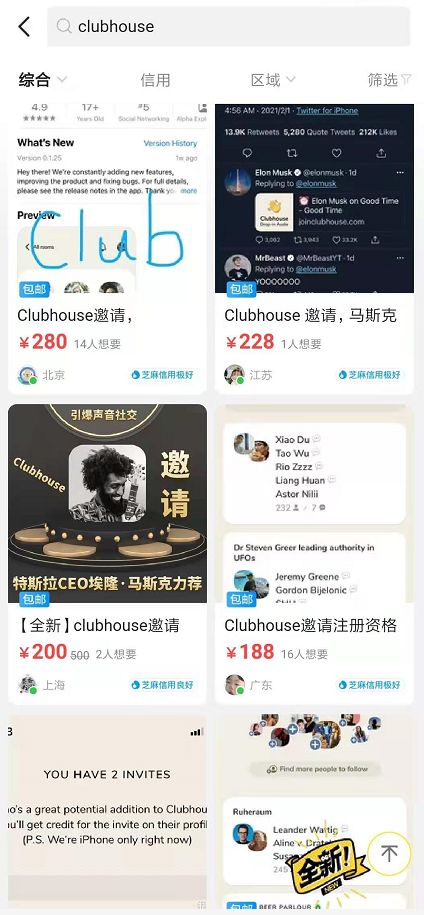 目前,一个clubhouse邀请码已经在闲鱼上炒到了150-500元。