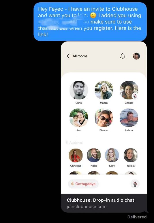 并且软件采取邀请制,一位激活用户可以凭借自己的手机号邀请两位好友,但不是简单地给一个邀请code。而是需要用户将对方手机号存入自己的通讯录后,发送邀请给通讯录中的好友。可以看出clubhouse是一款非常强熟人社交的软件。
