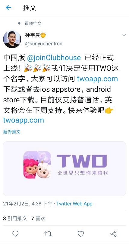 至于孙宇晨老师投资做的对标中文版clubhouse——TWO其实更像一个交友软件,我放上产品界面,大家自己感受一下吧。