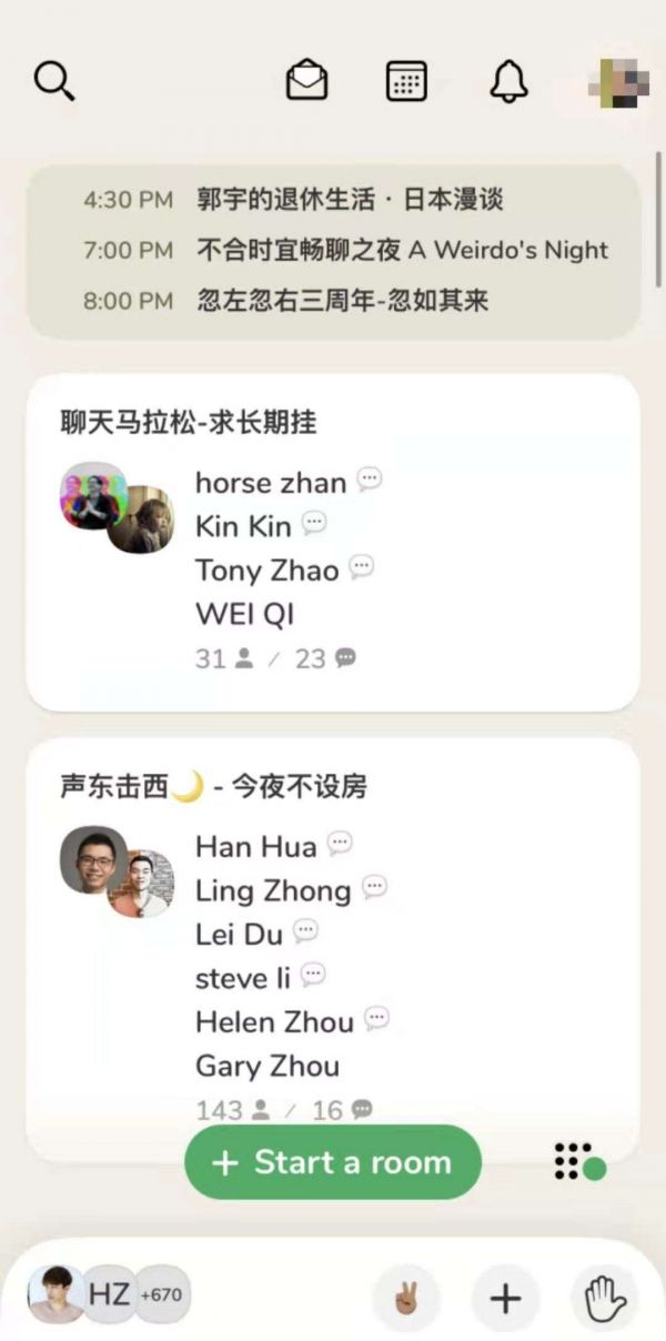 最先拥有邀请码注册进去的用户一看,很多互联网圈和播客圈的名人都在这里“开房”讨论,孙宇晨在聊准中年男人的破碎生活,声东击西的播主在聊播客商业化,还能听到来自硅谷的投资人、创业者的观点声音。就连知乎创始人周源、微博CEO王高飞、金沙创投主管合伙人朱啸虎等人也纷纷进入clubhouse。