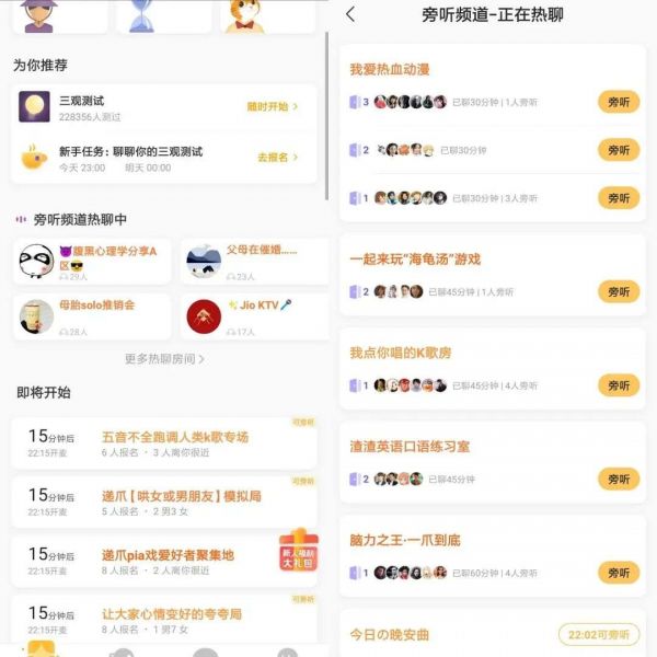 注册激活后,软件会读取用户的通讯录好友并且根据用户所选兴趣为其推荐房间。