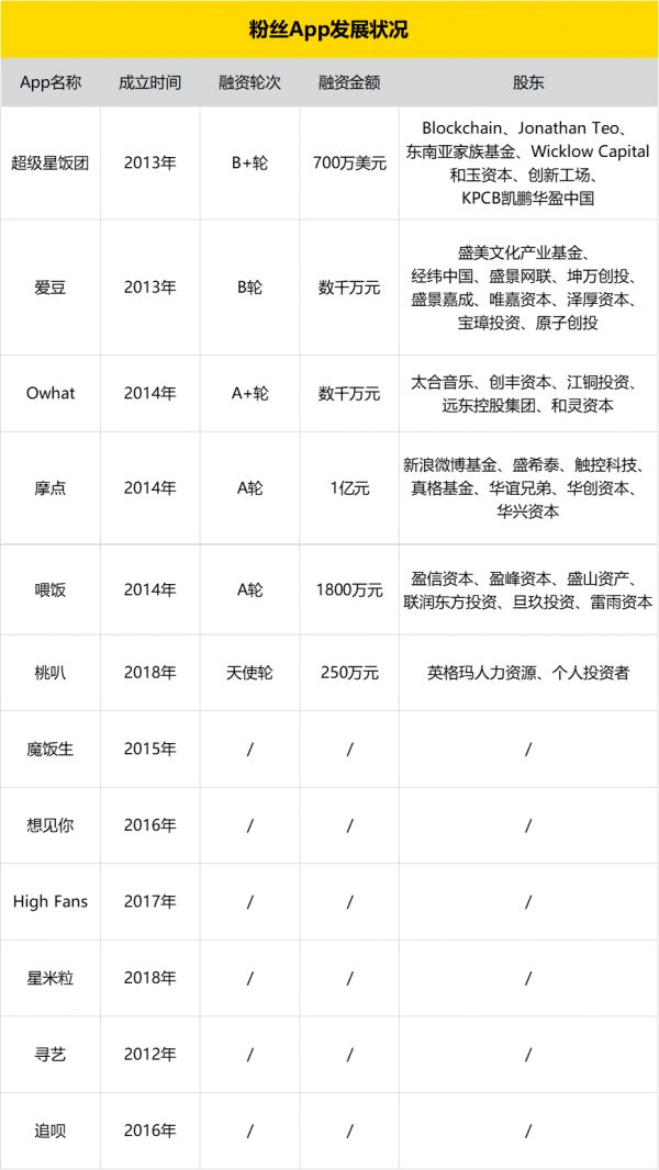 2013年成立的爱豆,已经获得B轮融资,股东中不乏经纬中国这样的一线基金;2014年成立的Owhat,也已走到了A+轮,背后有太合音乐等行业资本的加持。但这些项目的融资基本停留在2018年以前。2015年以后入场的项目,鲜少有获得融资。