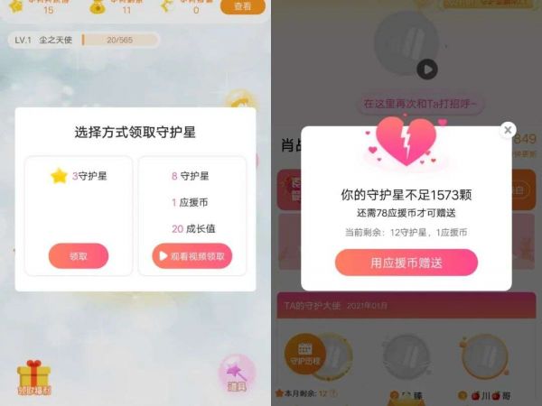 相比之下,有些App的玩法就复杂一些。例如,用户只要在爱豆App上选择了守护的艺人后,可以通过签到领取守护星,但如果观看了一段广告便会获得额外的守护星和应援币。在打榜页面,用户点击页面下方的守护星,会收到“守护星和应援币不足”的系统提醒,需要额外购买。此外,爱豆App还推出了会员服务,单月费用为22元,用户购买后可以享受补签到、双倍签到奖励、高清直播等功能。