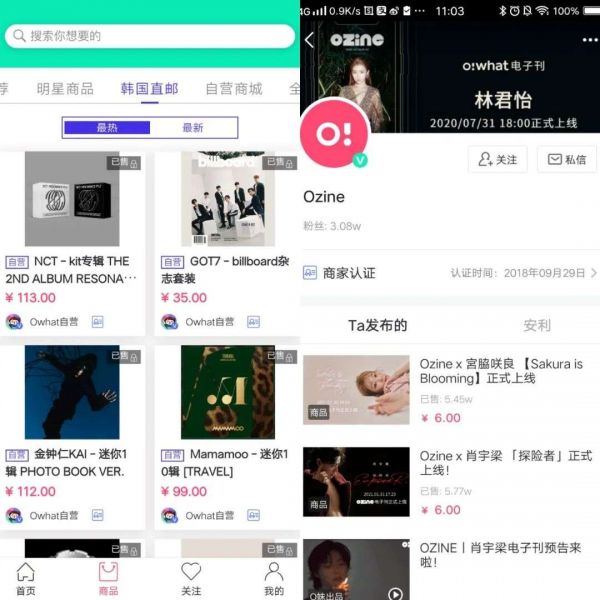 当站内资源无法满足平台的变现需求时,一些粉丝App将视野投向了站外。例如,魔饭生App提供了商场、地铁等应援广告位的咨询和购买服务,通过中介服务赚差价。也有一些粉丝社区平台在探索明星周边的生意。比如Owhat便推出了自营商店,售卖韩国明星的专辑、杂志周边、同款配饰等,同时还上线了与明星联名的电子刊Ozine, 单个刊物的售价为6元。还有一些平台尝试从票务变现,例如主打明星行程追踪的“喂饭”,除了提供明星行程的爆料,还出售演唱会和见面会的门票。