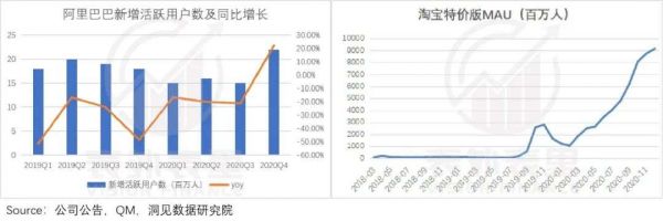 财报数据显示,阿里2020Q4新增活跃用户数,由下降转为上升,同比增速也再次转正;同时,据QM数据,2020年淘宝特价版的MAU增长至近1亿。