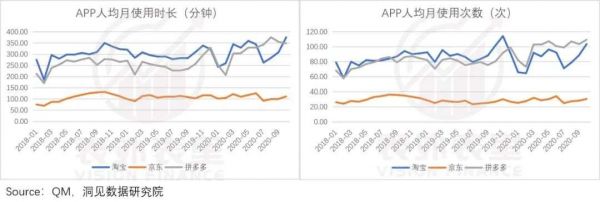 如下图所示,2020年9月淘宝的使用时长重新超过拼多多,使用次数也与拼多多的差距逐渐缩小。