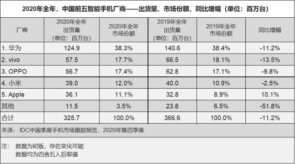IDC数据显示,2020年全球智能手机市场出货量为12.92亿台,同比下跌5.9%;中国智能手机市场出货量为3.26亿台,同比下跌11.2%。