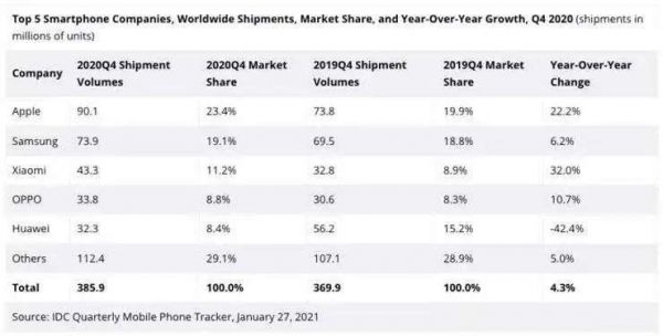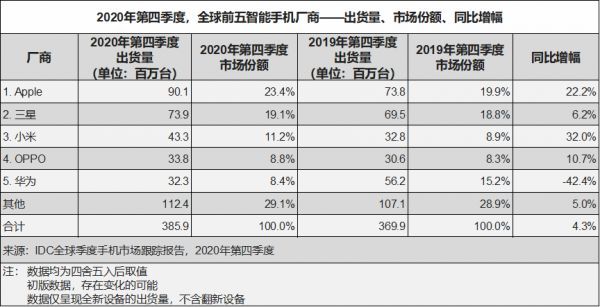 2020年四季度,iPhone全球出货量高达9010万台(同比增长22.2%),这不仅让苹果重新夺回全球最大智能手机厂商头衔,而且还创造了厂商单季度出货量的历史新高。