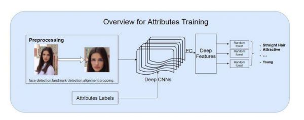 总的训练过程如图 3 所示。首先,将图像和特征标签输入至深度 CNN 并抽取特征,然后用全连接层进一步处理这些特征。最后训练 40 个随机森林分类器进行特征评估,最后输出特征结果。