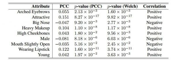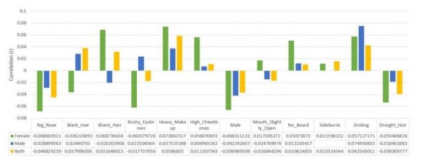 此外,有一个名为男性化(Male)的性别属性,从我们的深度模型来看,这个预测在 CelebA 中是令人信服的(95 % 的准确率)。然而,我们发现了一个有趣的结果,一些来自 Beauty 799 数据库的女性图像在模型结果中被估计为男性,这表明这些女性有一些男性特征(男性倾向),并且她们被认为不太有吸引力。此外,根据相关性分析,这种男性化属性会降低吸引力。这个例子从反面证明了女性特征可以增加吸引力。