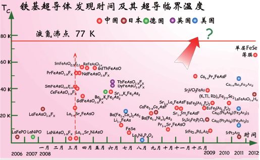 2008年,日本科学家发现超导临界温度超过40K的含铁的化合物,即铁基超导体。中国科学家迅速跟进,并将超导临界温度提高至55K,在极短的时间内吸引了全世界超导学者的目光,再次为中国超导科学赢得声誉。