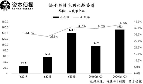 快手线上营销服务收入在2018年、2019年及2020年上半年分别同比增长326.3%、345.5%和222.5%,营销服务收入占比也从2017年的4.7%,一路爬升至2020年上半年的28.3%(2018年、2019年占比分别为8.2%和19%)。