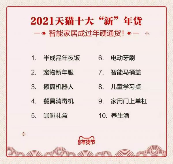 在天猫发布的2021十大“新”年货中,半成品年夜饭排名第一,宠物新年服排名第二,智能家居产品、健身产品也赫然在列。除了食品是亘古不变的新春必需品之外,中国人对运动健身、新科技、萌宠一类满足家庭生活需求的产品也呈现了明显的消费趋势。