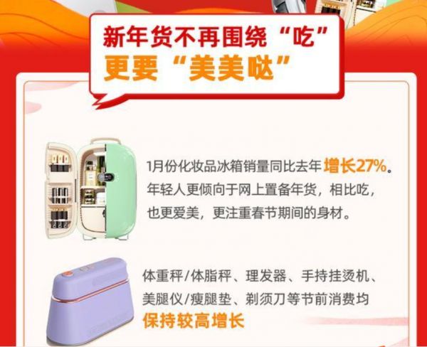 比如自1月份以来,化妆品冰箱的销量增长超过27%。体重秤、体脂秤、挂烫机均保持着较高增幅。清洁类商品中,洗地机销量增长35倍以上,烘鞋机、内衣清洗机也备受消费者青睐。厨具产品中,空气炸锅的销量增长了87%,牛排机则增长2倍。这类打着健康、便捷等标签的产品在2020年也常出现在抖音、小红书等平台的广告位上,被用户种草。