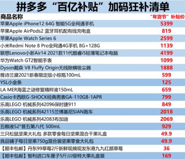 比如拼多多的“百亿补贴”再度加码,iPhone、雅诗兰黛、智利车厘子等品牌或商品的折扣力度提升至最大化。另外,拼多多还派发了30亿的优惠红包,营造“新春大甩卖”的气氛,年货节活动将持续到春节前。