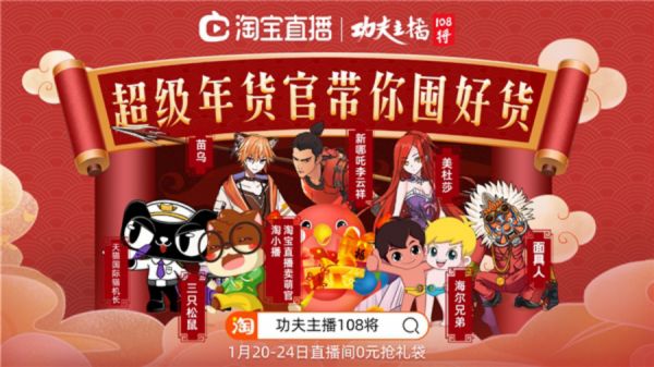 同时,随着国潮、二次元等潮流文化的受众连年攀升,且这类群体有着较强的购买力和传播力,部分平台也意图打中小众文化领域,结合品牌调性、年货氛围开启了虚拟直播。比如淘宝推出的用于挖掘主播生态空间的厂牌“功夫主播108”便陆续登场,为年货节引流。