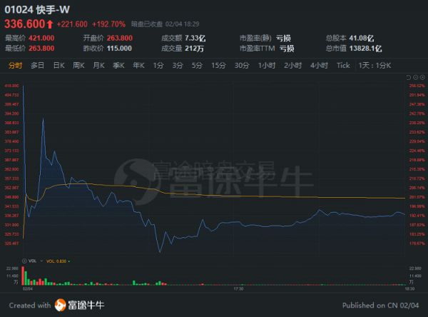 快手在富途暗盘一度涨至266.1%,最终收报336.6港元,较招股价涨192.7%。此外,快手暗盘成交额同样活跃,在富途暗盘开盘仅30分钟后,快手的成交额即达到5亿港元,荣登富途暗盘成交额榜首。截至收盘,快手的总成交额达到7.33亿港元。