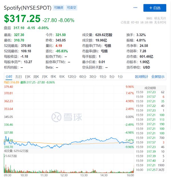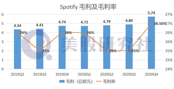 北京时间2月4日,Spotify发布了2020第四季度财报,财报显示,季度营收21.68亿欧元,同比增长17%-,季度净亏损1.25亿欧元,同比收窄40%,毛利率26.5%。在当日财报发布后,Spotify股价下跌逾8%。