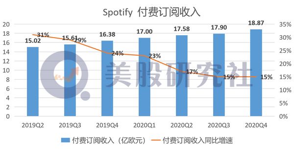 公司第四季度付费订阅营收18.87亿欧元,同比增长15%。结合2018年上市以来季度数据来看,付费订阅服务营收的增速一直在下滑。