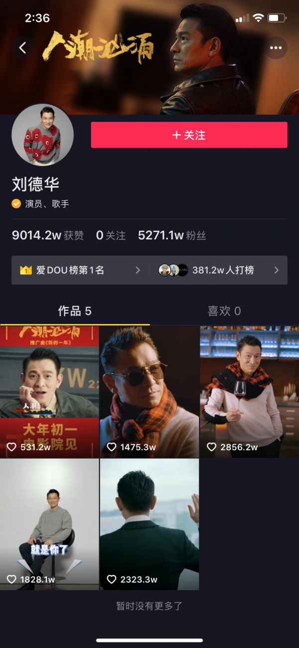 刘德华入驻抖音后迅速引发讨论狂潮:5个视频收获超5000万的粉丝,登顶平台“爱DOU榜”。这增粉速度,连咱们的王冰冰都要自愧不如。