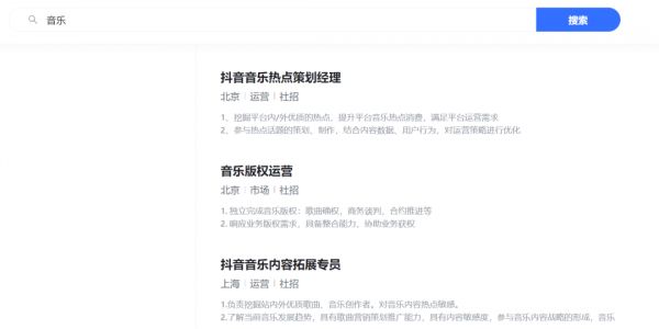 搜索字节跳动和快手的招聘官网可发现,前者在招的音乐相关岗位有66个,除少量属于大力教育或海外音乐平台Resso,大部分都是抖音音乐的岗位。这能看出抖音对音乐市场的重视,但从岗位介绍中,我们还看不到对产品特点的独特性描述。