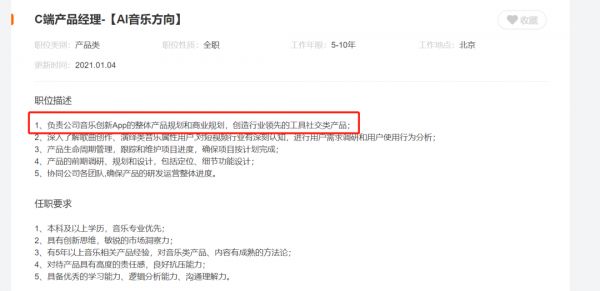 快手的相关在招岗位是10个,其中对音乐创新APP的描写都是“工具社交类产品”。仅从这些信息,暂时也很难感觉到它与网易云音乐、QQ音乐等有哪些大区别。