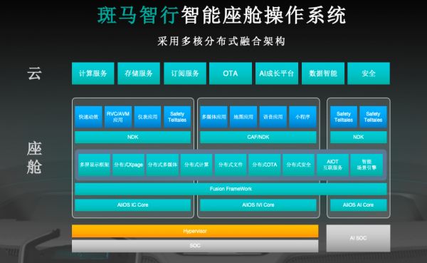 作为CloudCar在智能汽车产品上落地的重要载体,斑马智行智能座舱操作系统采用多核分布式融合架构,能将云、边、端计算、存储于服务的一体化融合。采用SOA软件架构Fusion分布异构融合,将实现服务原子化,主动服务用户。