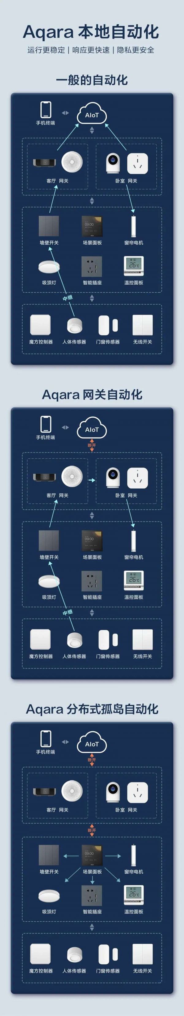 Aqara 产品的智能联动都追求最大限度实现本地化,以往的控制流程是开关-网关-位于某地的云端-网关-执行器,分布式组网则避开云端直接实现开关-网关-执行器的命令直达,或者开关-执行器,本地化传输令产品间的连接更加稳定,反馈更加迅速,同时保证了用户的隐私安全。由于 Zigbee 网络是自组网、自治愈的本地化网络,当家庭路由器断网时,仍然保持设备之间的稳定连接和联动。