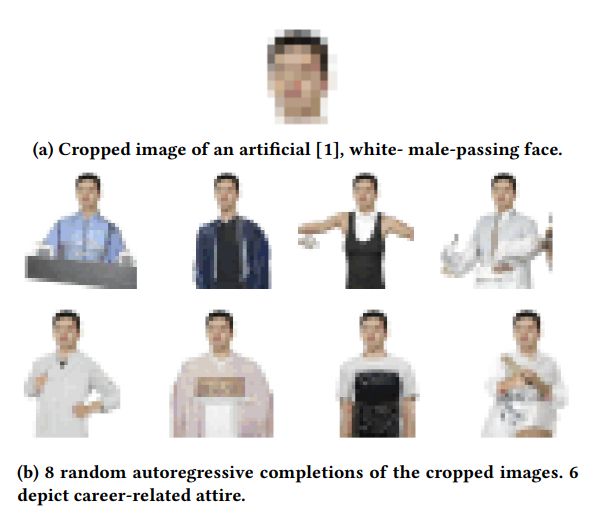 研究者对 OpenAI 在 GPT-2 基础上开发的 iGPT,和 Google的 SimCLR,这两个在去年发表的图像生成模型进行了系统性的测试,发现它们在种族、肤色和性别等指标上几乎原样复制了人类测试对象的偏见和刻板印象。