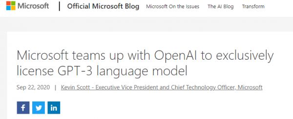 其中一家最知名的客户就是微软。去年9月,微软 CTO Kevin Scott 宣布将和 OpenAI 展开合作,独家获得 GPT-3 的授权,将其技术应用到面向微软用户的各项产品和 AI 解决方案当中。