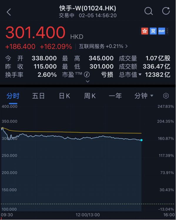 2021 年 2 月 5 日快手上市,当天收盘价格 300 港元、成交量 1.2 亿股,总市值 12325 亿港元(约合 1589 亿美元)。