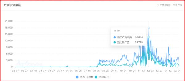 根据 App Growing Global 数据,自 2020.2.7 到 2021.2.5,Snack Video 共计投放了 33.25 万个广告素材,其中 29.21 万个有在印尼投放。最多时候一天就会上线 1.8 万个广告素材,投放确实大手笔。