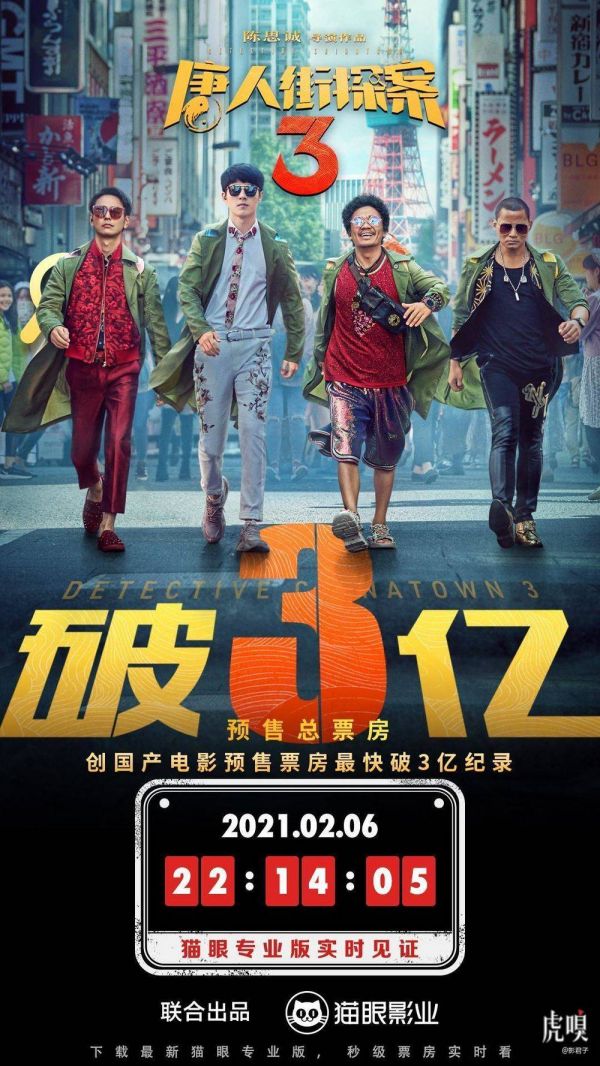 @界面新闻【唐人街探案3创造国产电影预售最快破3亿纪录】据@猫眼专业版 微博消息,猫眼专业版实时见证2月6日22:14:05,唐人街探案3预售总票房破3亿,创造国产电影预售最快破3亿纪录。